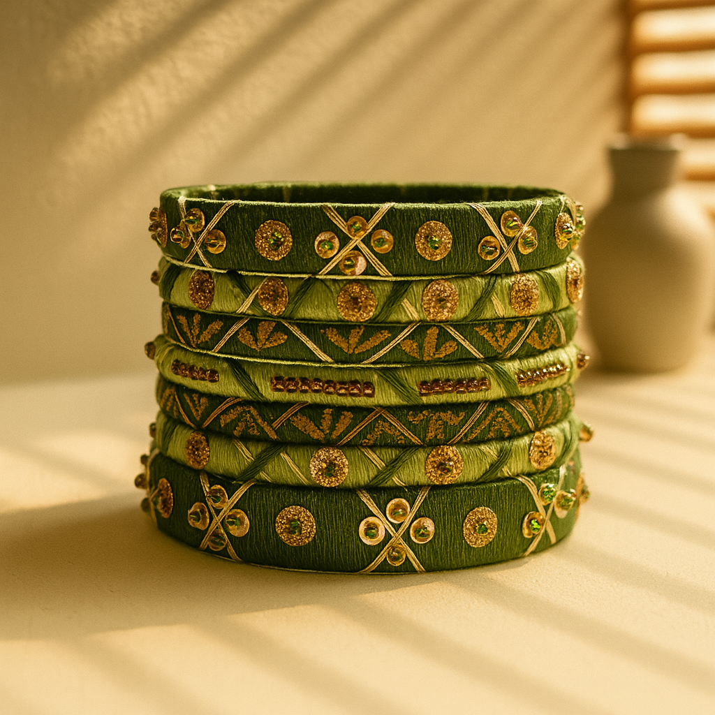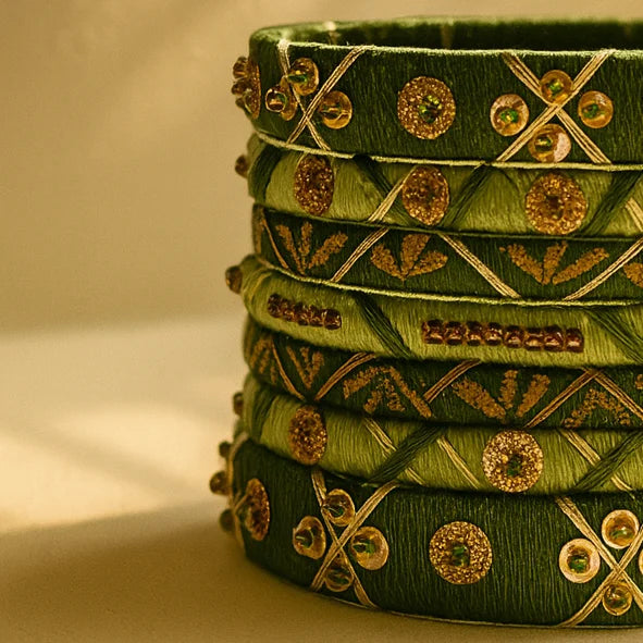 The base is wrapped in deep green thread and uplifted with gold embroidery in a criss-cross pattern and delicate bead work. Shimmering round sequins and fabric hand-painted patterns gives it a handcrafted charm. Custom colors and sizes are also available for all ages.
