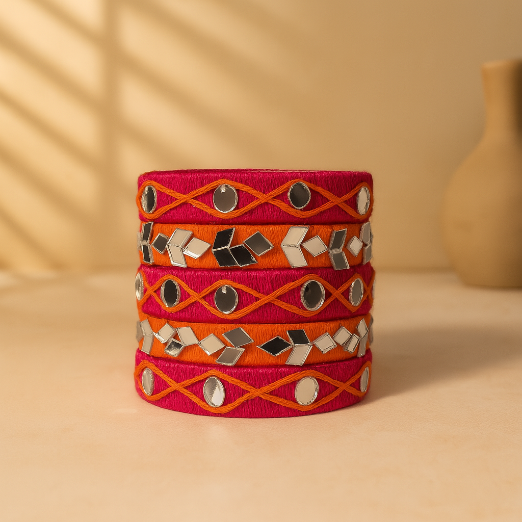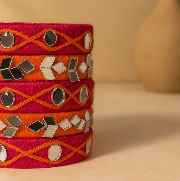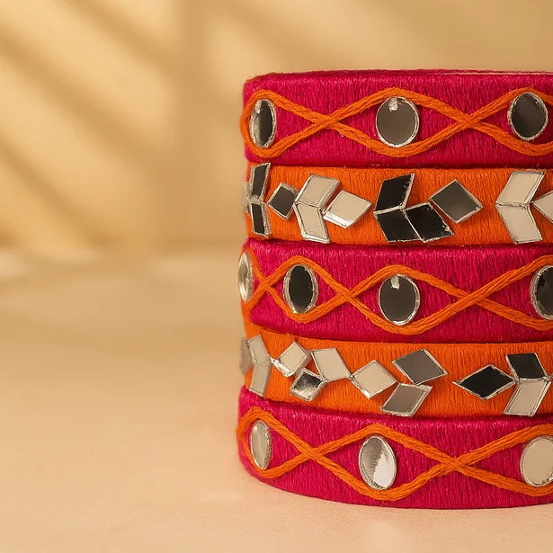 Bold and eye-catching, this handcrafted bangle set pairs rich deep pink with vibrant orange for a striking look. Each bangle is carefully wrapped in fine anchor threads, featuring geometric mirrorwork and orange criss-cross thread patterns. The mirrors and pattern designs create depth and shine. Despite the intricate detailing, these bangles remain lightweight and comfortable for all-day wear. Custom colors and sizes are also available for all ages.